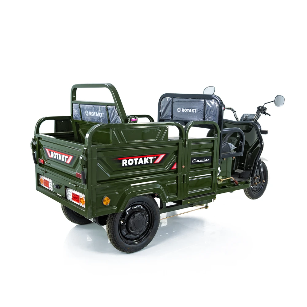 Triciclul electric **Rotakt Courier** este soluția ideală pentru transportul urban eficient și ecologic. Acest vehicul utilitar electric a fost special conceput pentru livrări rapide, transport de marfă ușoară și activități comerciale desfășurate în orașe. Cu dimensiuni generoase (2710 mm lungime, 1050 mm lățime, 1145 mm înălțime), Courier oferă o platformă de încărcare cu dimensiuni exterioare de 1260 x 900 x 420 mm, perfectă pentru diverse tipuri de sarcini.